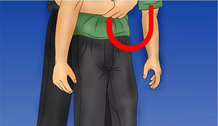 La persona che pratica la manovra si posiziona in piedi dietro colui che sta soffocando, cingendola con le braccia intorno ai fianchi, sotto le braccia. Una mano è piegata con il pugno chiuso e viene posizionata con la parte del pollice appiattita contro l’addome nella zona tra lo sterno e l’ombelico. L’altra mano afferra il pugno e provoca una serie di rapide e profonde spinte verso l’alto finché l’oggetto che ostruisce le vie aeree non viene espulso. Le spinte non devono mai comprimere o stringere la gabbia toracica, ma solo la parte molle dell’addome. Le nuove linee guida di European Resuscitation Council prevedono che vengano alternate 5 compressioni sottodiaframmatiche e 5 colpi dorsali tra le scapole.