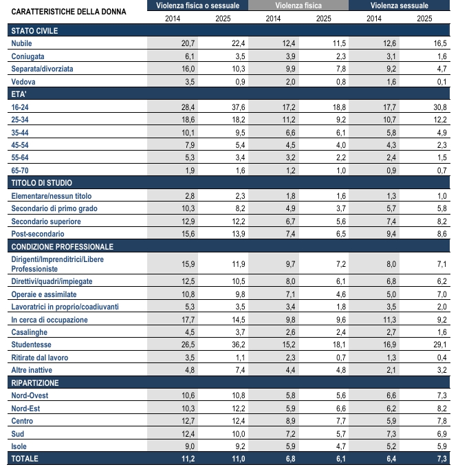 | Stupri e tentati stupri | 3,5% → pari a oltre 705.000 donne |