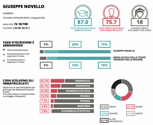Nel caso di Lodi e provincia, l’istituto che presenta il valore più alto – e che quindi risulta quello che viene portato a termine in maniera più continuativa – è invece il liceo classico Giuseppe Novello di Codogno con una percentuale di 83,9% di diplomati in regola. Secondo la ricerca, è qui che il percorso scolastico appare meno accidentato e dove il numero di studenti che completano i cinque anni nei tempi previsti risulta più elevato rispetto agli altri istituti del territorio.