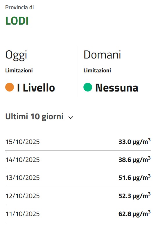 Nella provincia di Lodi, le misure temporanee di primo livello erano state introdotte a partire da martedì 14 ottobre 2025 dopo che i dati di ARPA Lombardia, avevano rilevato valori del PM10 superiori al valore limite per cinque giorni consecutivi.