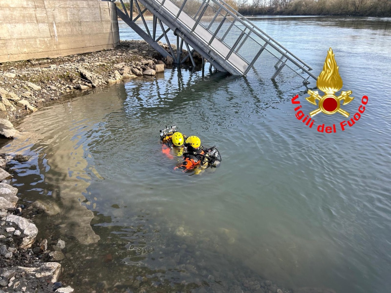 Per escludere il coinvolgimento di persone, è stato effettuato un sorvolo dell’area con l’elicottero Drago, proveniente dal reparto volo di Malpensa. Parallelamente, i droni hanno realizzato una mappatura aerea dettagliata della zona interessata dal crollo. Sul fronte delle operazioni in acqua, gli specialisti sommozzatori del nucleo di Torino stanno ispezionando attentamente lo specchio d’acqua sottostante la passerella.