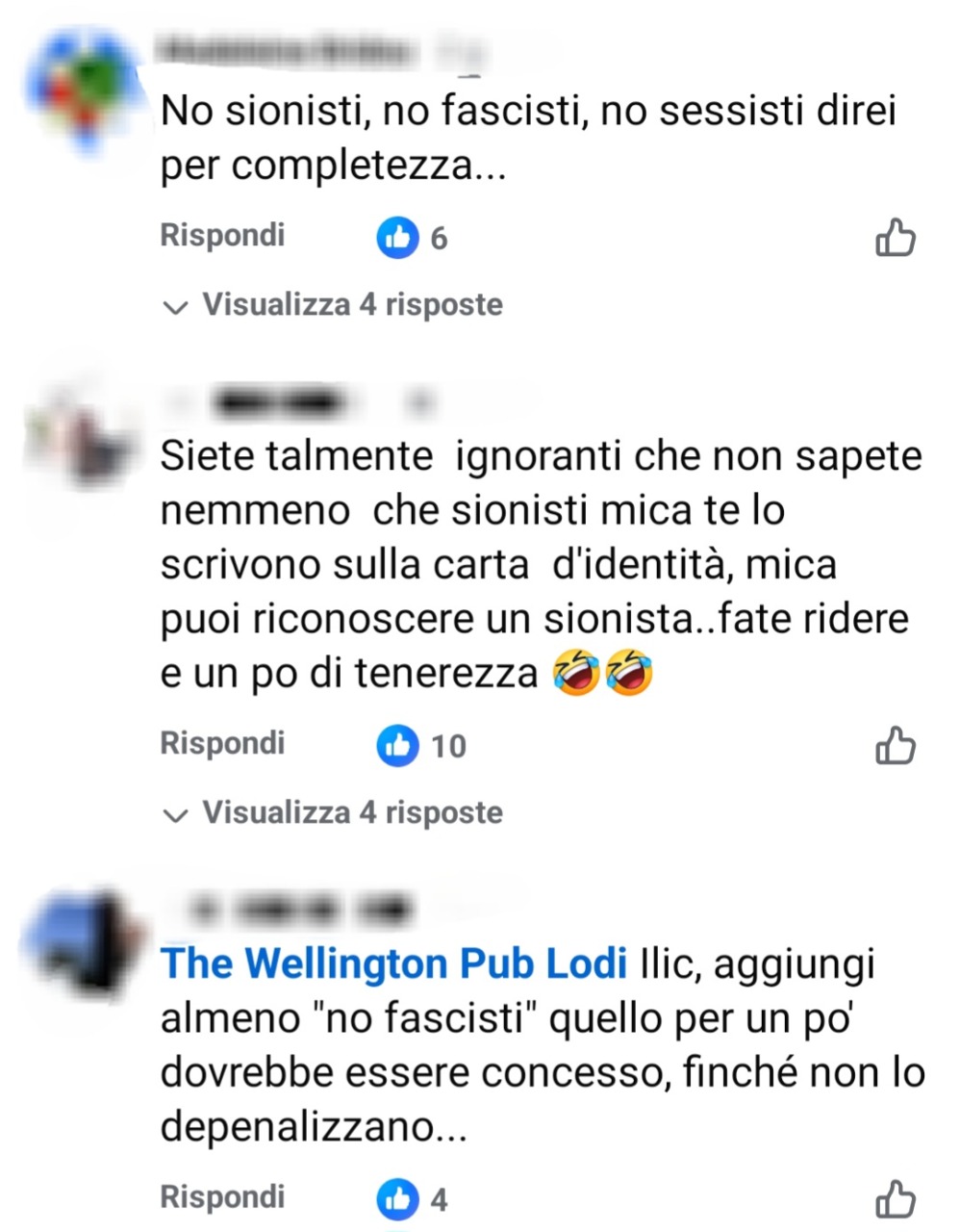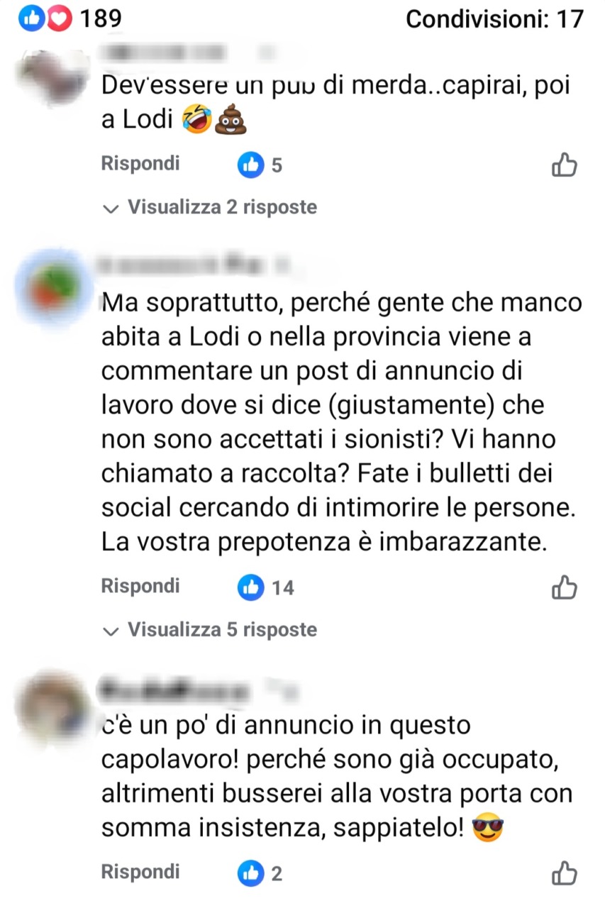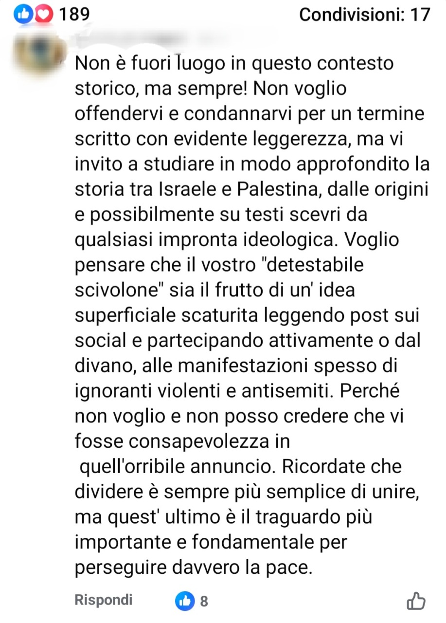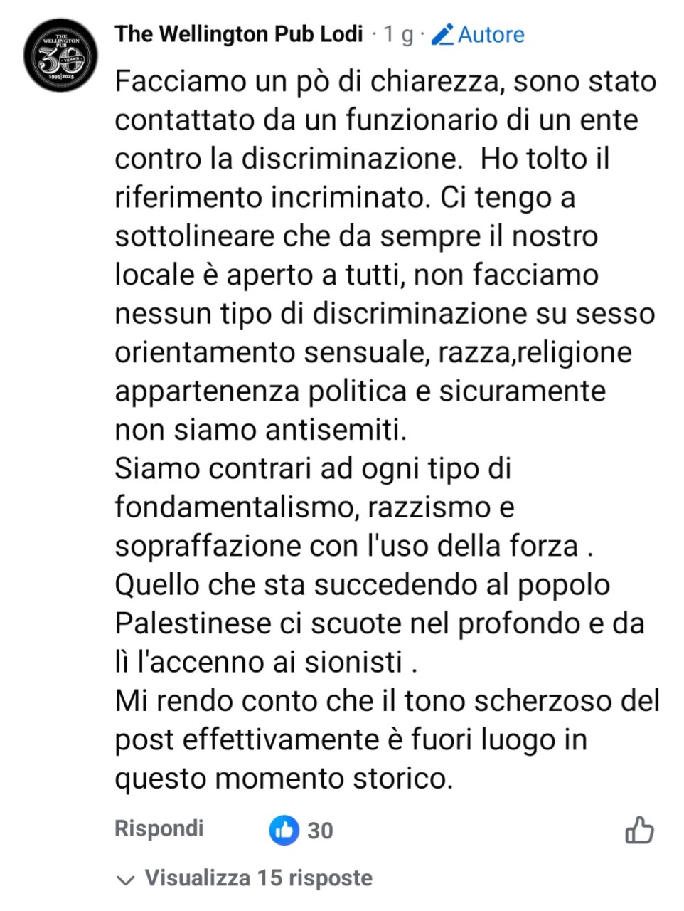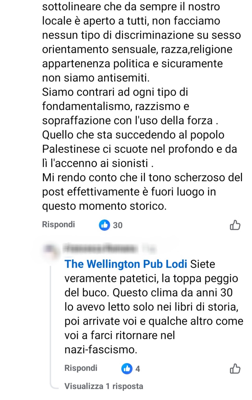 “Facciamo un po’ di chiarezza: sono stato contattato da un funzionario di un ente contro la discriminazione. Ho tolto il riferimento incriminato. Ci tengo a sottolineare che da sempre il nostro locale è aperto a tutti: non facciamo nessun tipo di discriminazione su sesso, orientamento sessuale, razza, religione, appartenenza politica e sicuramente non siamo antisemiti. Siamo contrari a ogni tipo di fondamentalismo, razzismo e sopraffazione con l’uso della forza. Quello che sta succedendo al popolo palestinese ci scuote nel profondo, e da lì l’accenno ai sionisti. Mi rendo conto che il tono scherzoso del post, effettivamente, è fuori luogo in questo momento storico”.