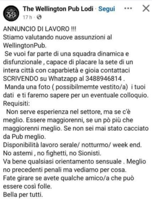 Requisiti: Non serve esperienza nel settore, ma se c’è meglio. Essere maggiorenni, se un po’ più che maggiorenni meglio. Se non sei mai stato cacciato da pub meglio. Disponibilità lavoro serale / notturno / week-end. No astemi, no fighetti, no Sionisti. – parola poi eliminata dopo la modifica del post – Va bene qualsiasi orientamento sessuale. Meglio no precedenti penali, ma vediamo per cosa. Fate girare se avete qualche amico/a che può essere così folle. Bella per tutti.”