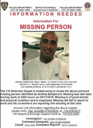 Zamperoni lavorava da alcuni mesi in un importante ristorante della Grande mela, il ristorante Cipriani Dolci al Grand Central Terminal, come capo cuoco. Diffuso un appello di ricerca: sono stati gli stessi colleghi preoccupati a informare il dipartimento di polizia.