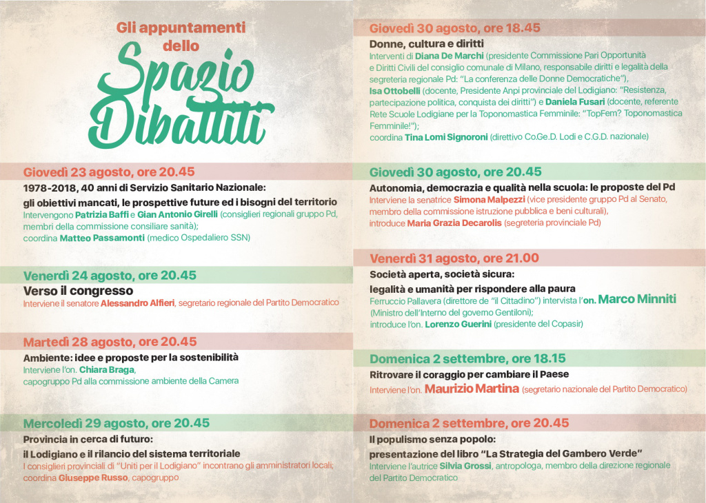 Qui il programma degli eventi. La prima giornata prevede presso lo Spazio Dibattiti, alle 20.45, l’incontro sul tema “1978-2018, 40 anni di Servizio Sanitario Nazionale: gli obiettivi mancati, le prospettive future ed i bisogni del territorio”, con la partecipazione di Patrizia Baffi e Gian Antonio Girelli, membri della commissione sanità del consiglio regionale della Lombardia (coordinerà Matteo Passamonti, medico ospedaliero SSN).