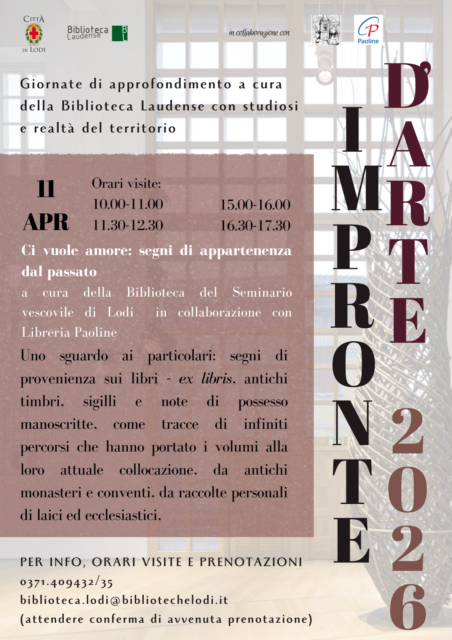 “Impronte d’arte 2026” è il ciclo di incontri della Biblioteca Laudense dedicato alla valorizzazione del fondo antico, con visite mensili da marzo a maggio e il coinvolgimento di studiosi e realtà culturali del territorio. L’appuntamento dell’11 aprile, “Ci vuole amore”, esplora ex libris, timbri, sigilli e note di possesso come tracce della storia dei libri provenienti da monasteri, conventi e collezioni private.