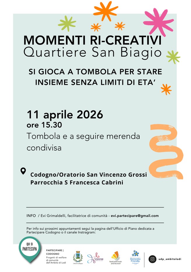 Appuntamento di quartiere l’11 aprile alle 15.30 all’Oratorio San Vincenzo Grossi di Codogno con una tombola aperta a tutte le età, seguita da una merenda condivisa. L’iniziativa, a ingresso libero, rientra nei “Momenti ri‑creativi” del Quartiere San Biagio ed è coordinata dalla facilitatrice di comunità Evi Grimaldelli.