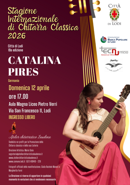 Concerto della giovane musicista internazionale Catalina Pires, chitarrista e violinista pluripremiata, in programma domenica 12 aprile alle 17.00 nell’Aula Magna del Liceo Verri con ingresso libero. Classe 2003, vincitrice di numerosi concorsi europei, Pires si esibirà in un recital che mette in luce il suo virtuosismo attraverso brani di Giuliani, Barrios, Ponce, Piazzolla, Tárrega, Castelnuovo‑Tedesco, Martín e Brouwer.