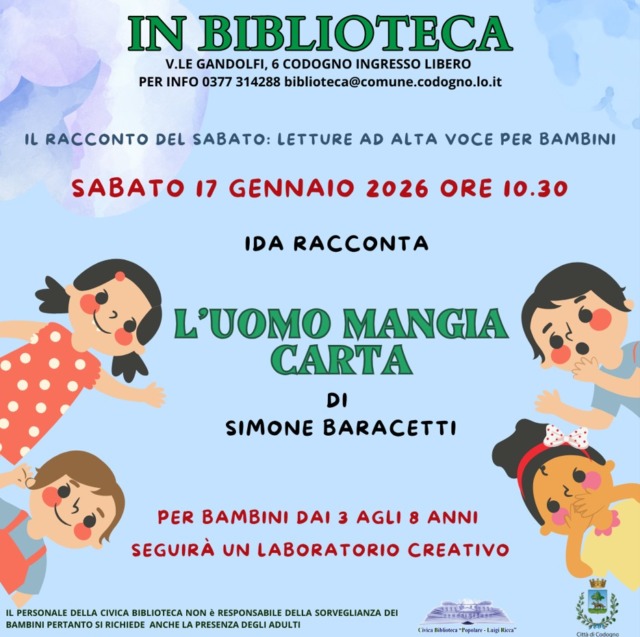 Alle ore 10.30 di sabato 17 gennaio, la Biblioteca Civica di Codogno apre le porte ai più piccoli con un nuovo appuntamento dedicato alla lettura. L’iniziativa rientra nel ciclo “Il racconto del sabato” con letture ad alta voce pensate per stimolare fantasia e ascolto. Protagonista dell’incontro è “L’uomo mangia carta” di Simone Baracetti, raccontato da Ida.