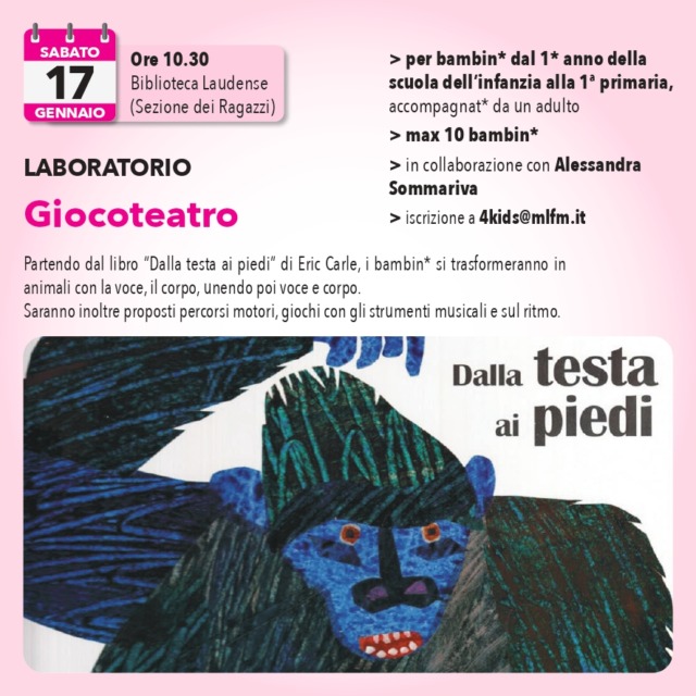 Alle ore 10.30 di sabato 17 gennaio, la Biblioteca Laudense – Sezione Ragazzi ospita “Giocoteatro”, un laboratorio espressivo dedicato ai più piccoli. L’attività prende spunto dal libro “Dalla testa ai piedi” di Eric Carle e invita i bambini a trasformarsi in animali attraverso il gioco teatrale.
