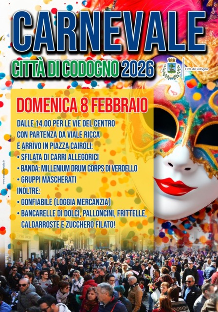 Domenica 8 febbraio torna l’appuntamento con il Carnevale di Codogno con partenza da viale Ricca (semaforo stazione) e arrivo in piazza Cairoli passando per via Garibaldi, via Roma, via Vittorio Emanuele, via Cavour e via Cavallotti.