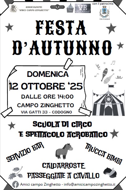 Tra pochi giorni parte a Codogno la “Festa d’Autunno”, un evento organizzato dall’Associazione Amici Campo Zinghetto con il patrocinio del Comune. La festa si terrà domenica 12 ottobre 2025, a partire dalle ore 14, al Campo Zinghetto in via Gatti. Durante la giornata saranno proposte numerose attività per grandi e piccoli tra cui una scuola di circo e uno spettacolo acrobatico.
