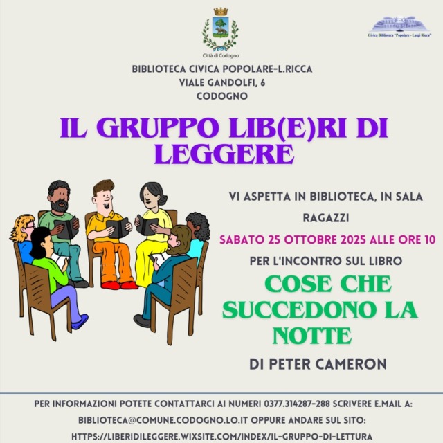 Continua il gruppo di lettura “Liberi di leggere” a Codogno, in provincia di Lodi, e dà appuntamento la prossima volta a sabato 25 ottobre alle ore 10 alla Biblioteca Civica Popolare-Luigi Ricca di viale Luigi Gandolfi per commentare assieme il libro “Cose che succedono la notte” di Peter Cameron.