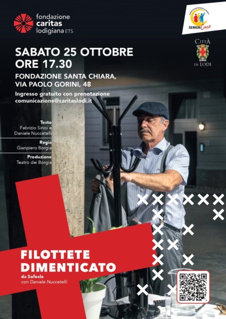 Caritas lodigiana, nell’ambito del progetto Senior Care, porta a Lodi lo spettacolo teatrale “Filottete dimenticato” che si terrà sabato 25 ottobre dalle ore 17.30 alle ore 18.30 alla Fondazione Santa Chiara di via Paolo Gorini. Nella tragedia di Sofocle, Filottete, imbarcatosi con i suoi compagni per la guerra di Troia, soffre a causa di una ferita alla gamba.